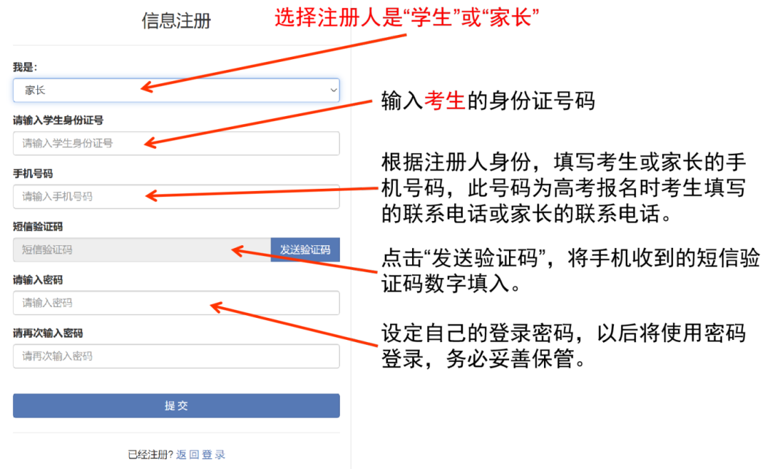 考生或家长注册登录时会使用考生高考报名时填报的信息和电话号码进行身份验证。