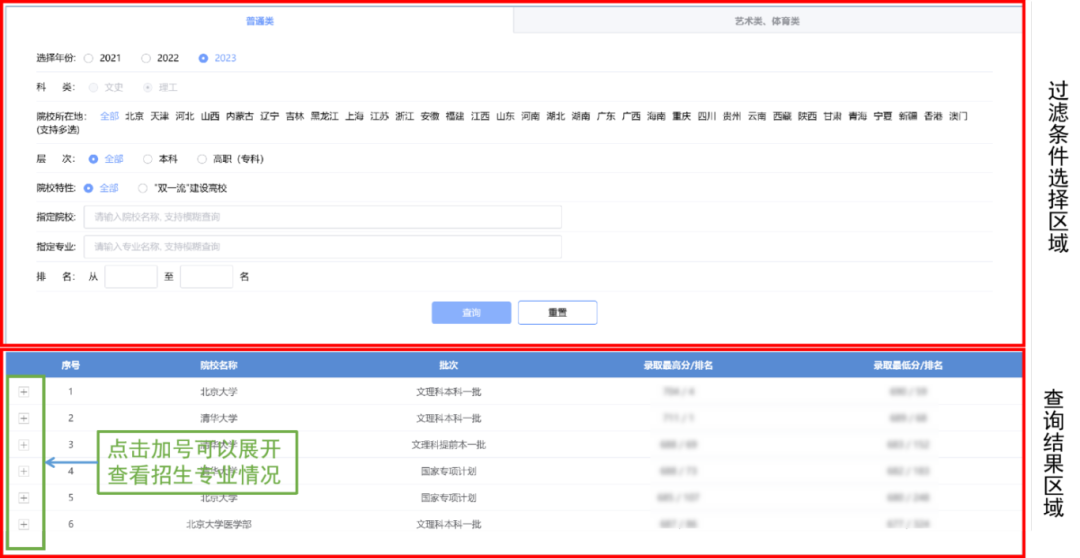 3. “历年录取数据查询”功能提供院校/专业最终录取的分数信息,而非录取当年公布的投档信息。统计结果不含征集志愿录取考生以及海空军招飞、强基计划、高校专项计划等特殊类型招生录取数据,同时因统计口径不同,可能与招生院校公布的录取结果有所不同。