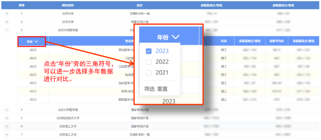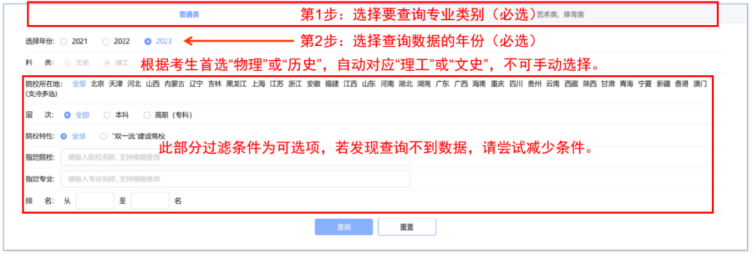 “历年录取数据查询”功能提供的是2021年-2023年分院校、分专业录取结果的统计数据,而考试院网站上公布的是当年投档的最低分和排名情况,两者可能存在差异。